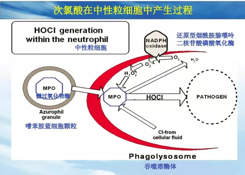 1996年,Lapenna D的研究表明,每106個(gè)中性粒細胞可產(chǎn)生0.1ul的次氯酸,此濃度可在5分鐘內殺滅1.5×107個(gè)大腸桿菌。